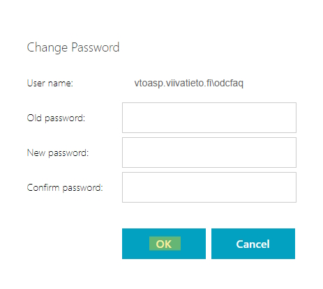 Syötä ”Old password” -kenttään nykyinen salasanasi. Syötä ”New password” ja ”Confirm password” -kenttiin uusi haluamasi salasana. Ota huomioon salasanavaatimukset. Tämän jälkeen paina ”OK” hiiren vasemmalla painikkeella. / Type your current password in ”Old password” -field. Type your new desired password in ”New password” and ”Confirm password” -fields. Please take in consideration password requirements. Press ”OK” with left mouse button when you’re done.